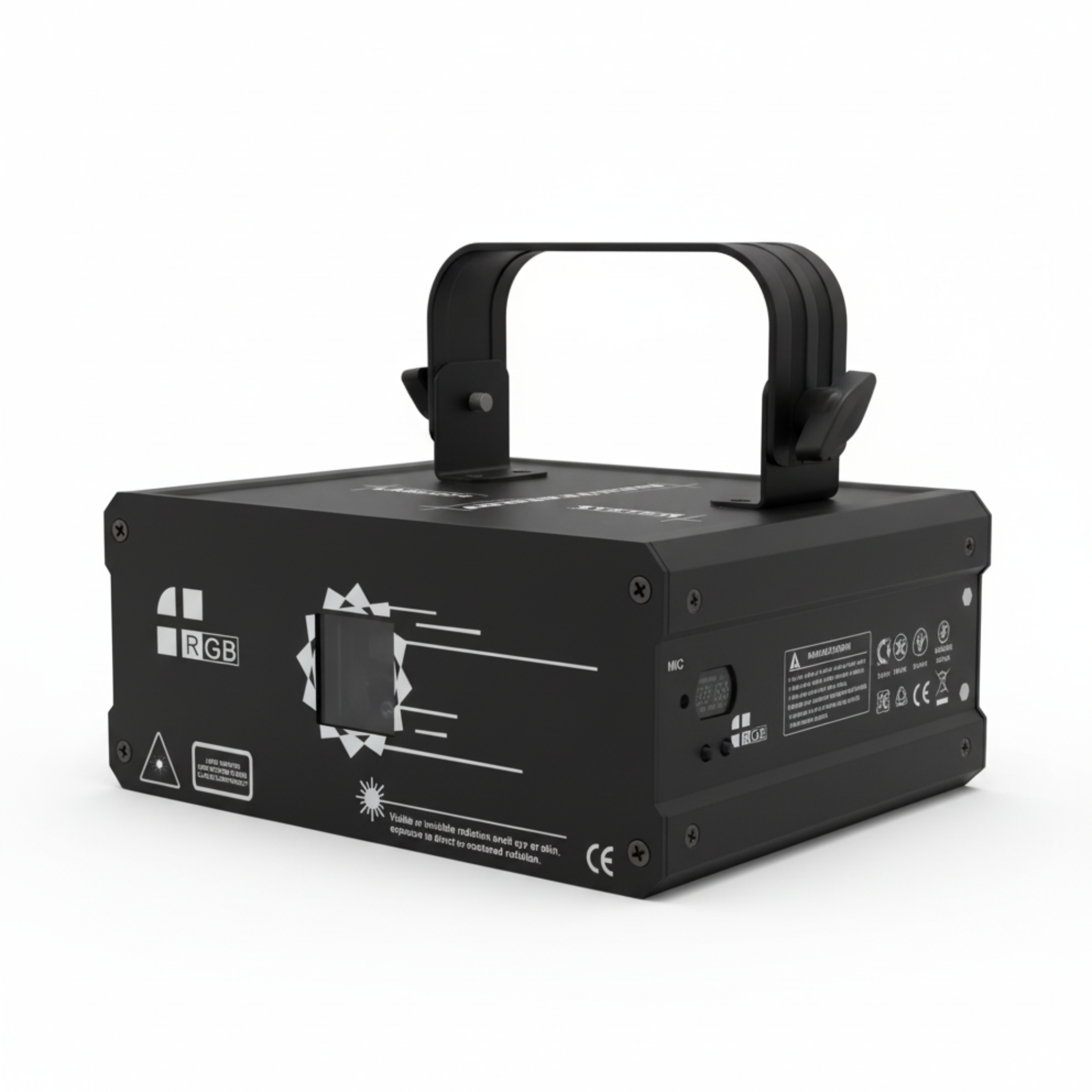 Portable multi-effect laser with battery power and RGB+UV effects.
